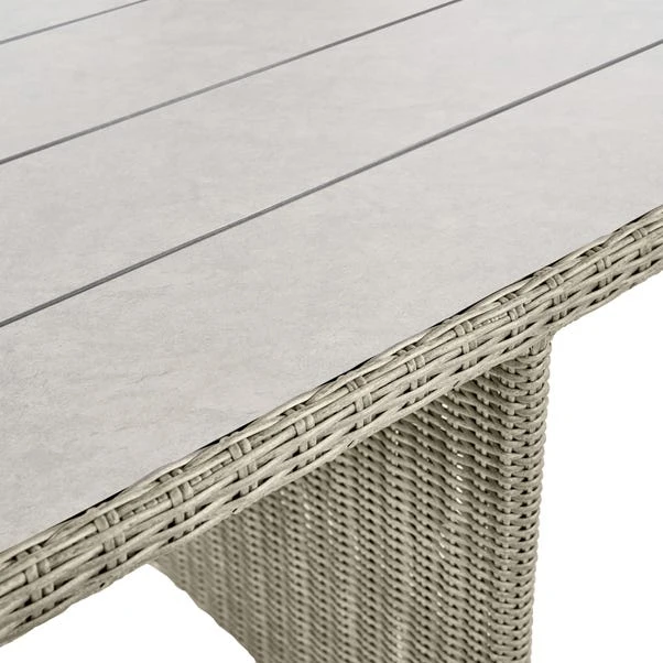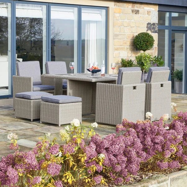 Experience a classy modern seating arrangement in your garden or outdoor space with the Bermuda Cube Set offering four seating spaces with versatile stools to raise your feet or perch on. The stylish design will bring a trendy feel to your outdoor space with the synthetic half round rattan weave effect and the option of a neutral slate grey or stone-grey colourway. With a weather resistant and UV protected design, this set is perfect for a low maintenance choice and each cushion is season-proof and fire retardant so whether it’s pouring down with rain or beaming with sun rays, they will prove long-lasting and durable.
