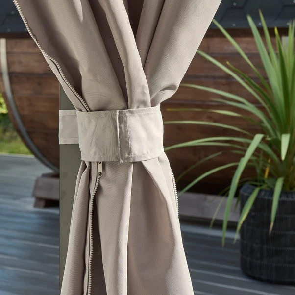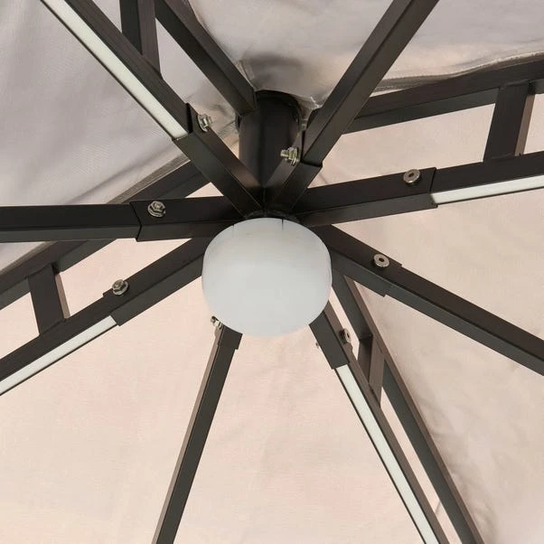 When your family gathers round for a late summer night, keep them shaded by popping up this gazebo! The vented roof is designed to circulate the air and keep you cool on hot summer days, while the included curtains help to keep out breezes and protect you from the sun and insects. With the central LED light and LED strip lights on the roof, you’ll be able to enjoy the gazebo even after the sun has set. This gazebo easily accommodates a six-seat dining set, making it the perfect place to entertain guests or enjoy a meal with your family. The sturdy build is made from a strengthened aluminium and steel frame, with a high quality polyester canopy that is weatherproof, ensuring that it can be used for many years to come.