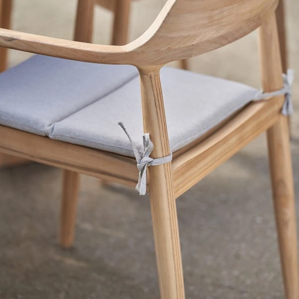 Introducing the Pacific Reuleaux 6-Seater Outdoor Dining Set, crafted from high-quality teak wood with a unique rounded triangle dining table featuring a chevron effect design. This set includes curved back chairs with light linen natural oatmeal Olefin cushions that are season-proof, resistant to staining, fading, and fire-retardant. Stylish and durable, this set comes with a 3-Year Structural Guarantee. Protect your set with an Aerocover when not in use to maintain its fresh, out-of-the-box look.