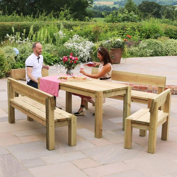 A large outdoor furniture set that includes two 5 foot benches and two 2 foot chairs. The strong and durable set is perfect for family gatherings as it can seat up to 6 people for dining, or more guests if socializing. Each piece has ample legs for support and a sleek, smooth design. The Philippa set consists of:- 1 x Rectangle Table (W: 1. 60m x D: 0. 76m x H: 0. 76m)- 2 x Benches (W: 1. 60m x D: 0. 45m x H: 0. 917m)- 2 x Chairs (W: 0. 75M x D: 0. 45m x H: 0. 917m