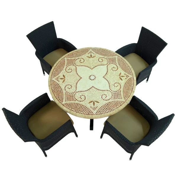 Bring a modern yet classic look into your garden with this stunning Provence dining table set. The Provence dining table has a heavy stone table top that has a mosaic design which has been hand laid. The Stockholm chairs have been crafted with a contemporary black rattan design. Full assembly of the set is required.