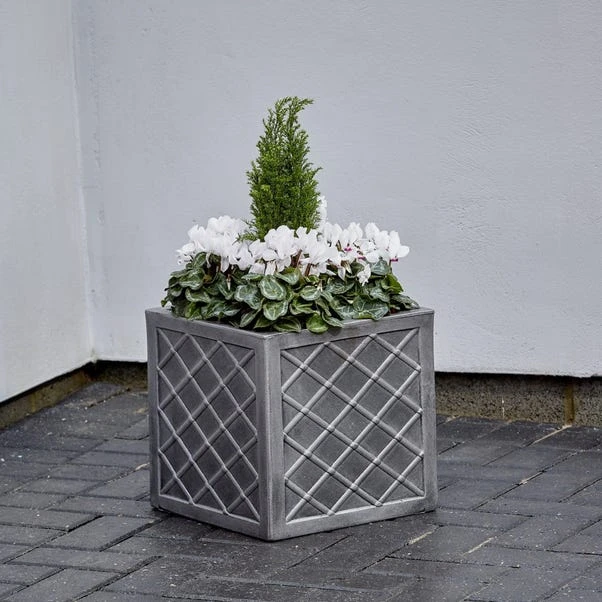 Crafted from durable plastic with a distressed grey finish, this square Lazio planter features a decorative metal effect design with a cross pattern. The planter is lightweight and is made in the UK. As the planter is frost resistant, it is ideal for both indoor and outdoor use. Available in a choice of two sizes so pick your perfect size!